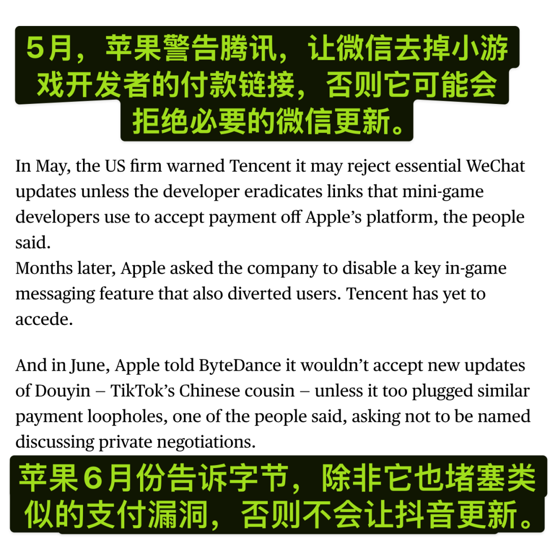 8 月初彭博社就報導,蘋果開始警告微信和抖音小遊戲裏的 “ 不規範支付行為 ” 。