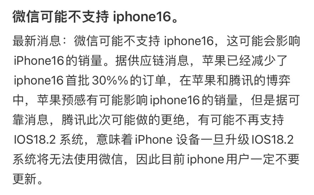 還有人説,騰訊這次在博弈中做得很絕,微信很可能不支持 iPhone16 和 iOS18.2 , iPhone 用户千萬不要更新。
