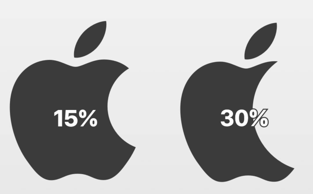 抽成分兩檔:30% 和 15% ( 年收入低於 100 萬美元的中小開發者 )。