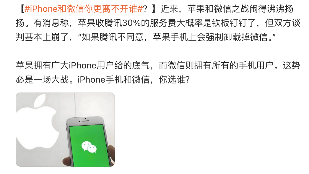 報道里都是 “ 可能 ”“ 大概 ” 的字眼,結果發起話題直接快進到**“ iPhone 和微信你選誰 ” ,成了一件民生大事。**