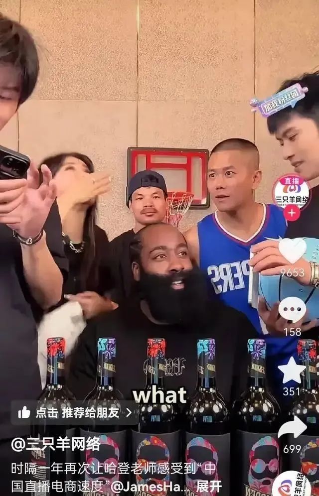 前不久,NBA球星哈登就再次現身小楊哥直播間,4萬多瓶紅酒上架12秒就被搶購一空。哈登興奮地喊道:我滴馬!小楊哥牛逼!