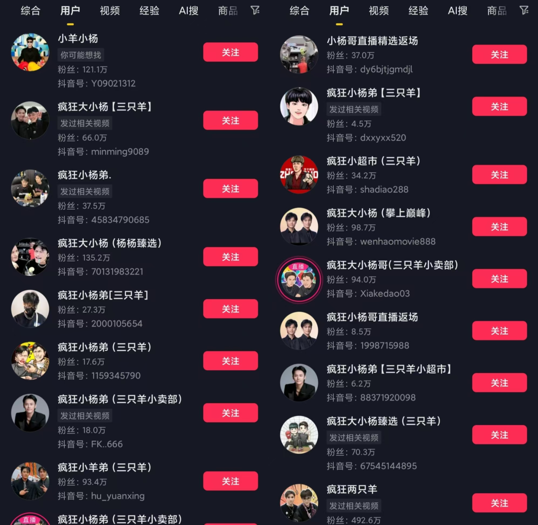 在抖音上搜“瘋狂小楊哥”,會出現一堆與之相關的賬號。不瞭解內情的人,很可能以為它們在蹭瘋狂小楊哥的流量,涉嫌侵權,但其實它們都是經小楊哥授權後產生的“分身”。