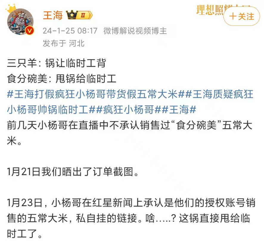 職業打假人王海曾舉報小楊哥帶貨假五常大米,小楊哥先是一口否認,後來王海透露,涉事賬號其實是三隻羊相關賬號“瘋狂小楊弟”。