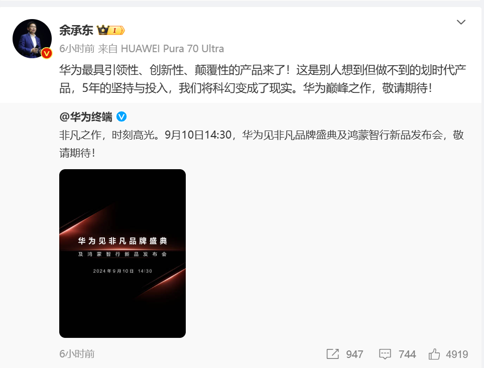 9月2日,華為終端在官微宣佈,將於9月10日正式召開新品發佈會。