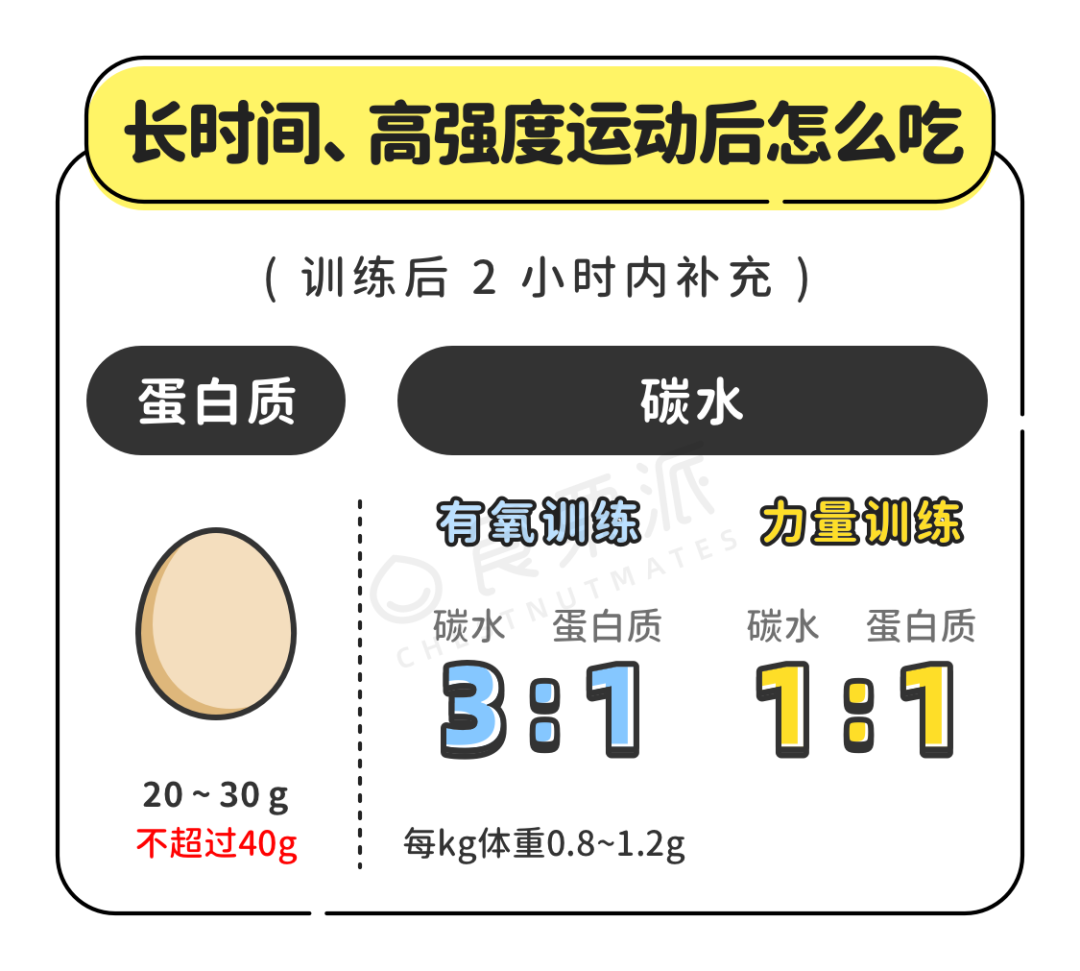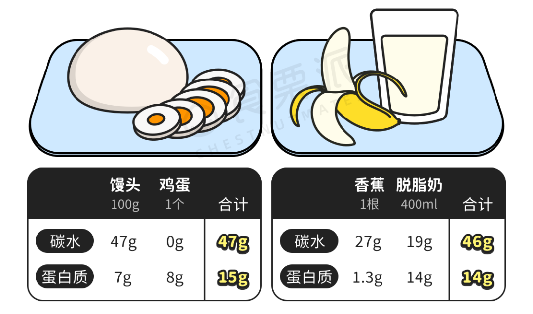 以 60公斤的人的為例,差不多就要攝入 48 克碳水化合物,12 ~ 14 克的蛋白質,一個饅頭+一個雞蛋,剛剛好。