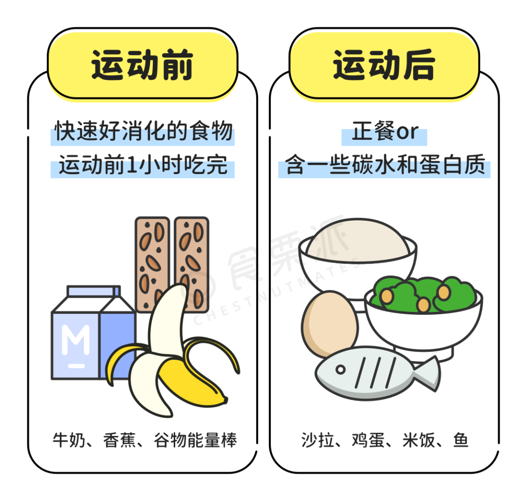 因為距離運動時間較短,所以食物選擇最好以好消化的碳水化合物為主,少量蛋白質和脂肪為輔,這樣既可以有效增加肌肉中的糖原儲備、延長訓練耐力,還能防止訓練時出現低血糖的情況。