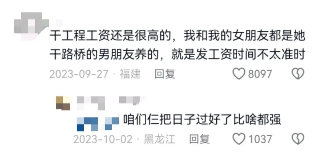 最離譜的是有人説他和他女朋友都是靠女孩子那個幹路橋的男朋友養活的,唯一美中不足的是發工資時間不太準時——也不知道這三位的日子是怎麼過下去的。