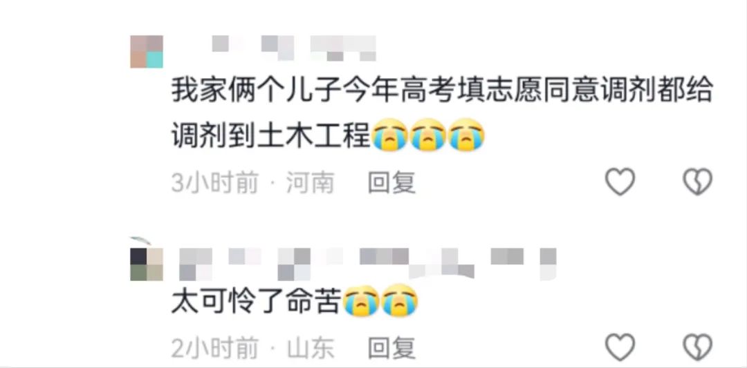 抖音上,有網友説自己倆孩子今年高考填志願同意調劑,結果直接都調劑到土木工程了。其他網友則表示:太可憐了,命苦。