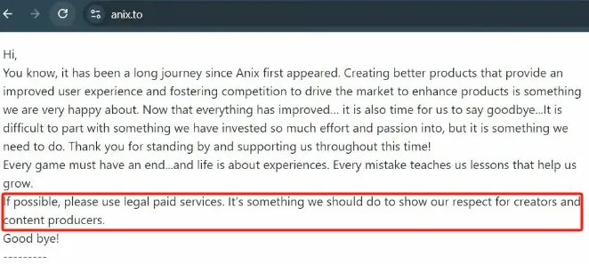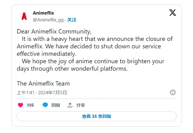 2024年7月5日,動漫流媒體網站“Animeflix”在沒有事先通知的情況下突然宣佈下線。