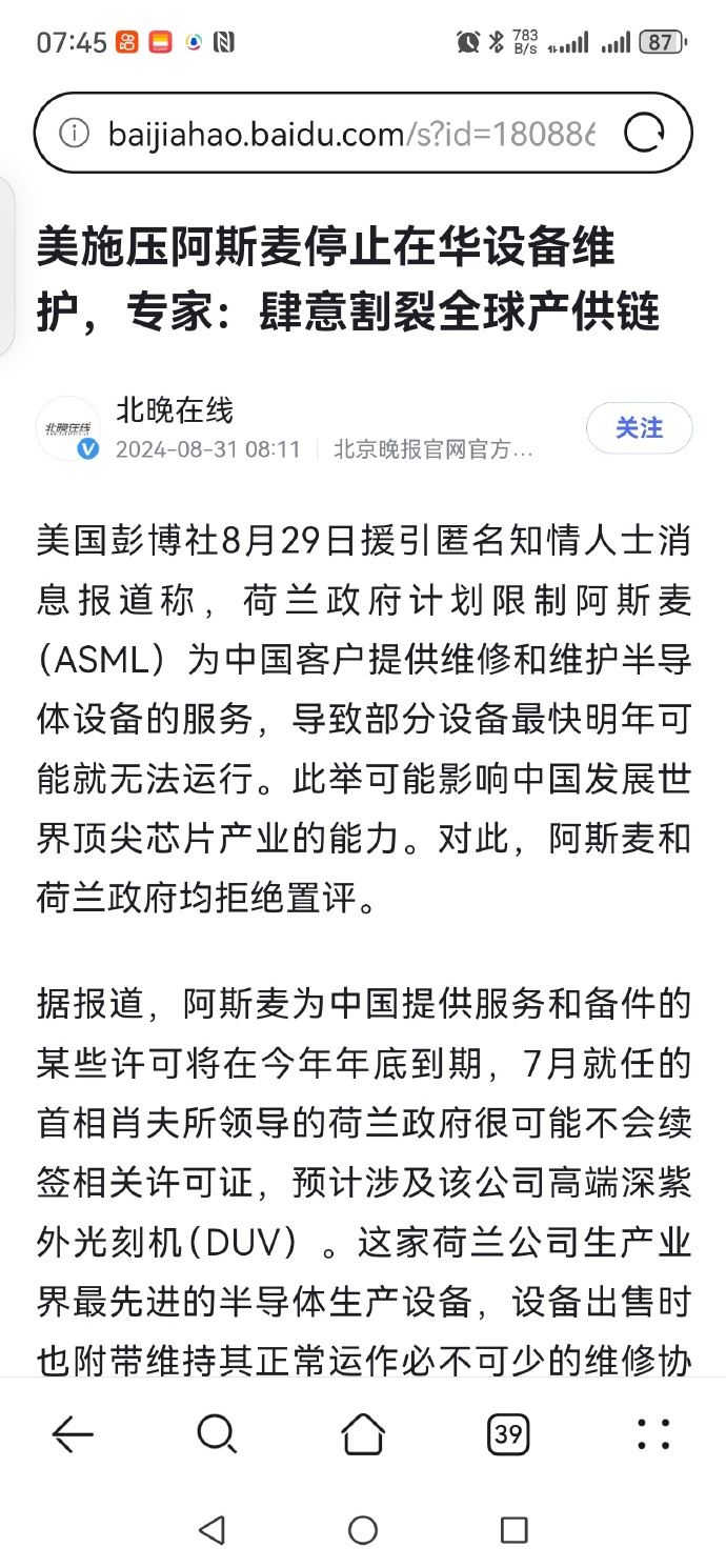 1.是否會真的終止維修服務,下結論現在還為時過早,如果這麼做,對於ASML的商譽有重大負面影響,代價極大。ASML自然是不願意,荷蘭政府也得面臨信用盡毀的考驗。ASML早就有消息説,不在荷蘭呆了,要搬到法國去,如果這樣,對荷蘭的經濟打擊很大。荷蘭自己肯定不想這麼幹,只不過是受美國的壓力承受不了,相信荷蘭還會想一些辦法的,進行拖延和討價還價,比如説某些型號不提供服務,對美國交代。其實大量的該怎麼辦就怎麼辦。