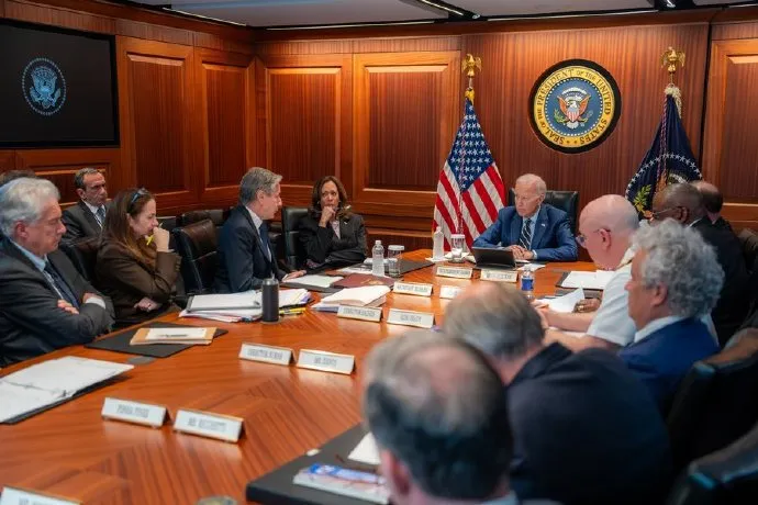 ▲8月5日,拜登和哈里斯聽取國家安全團隊對中東事態發展的報告。