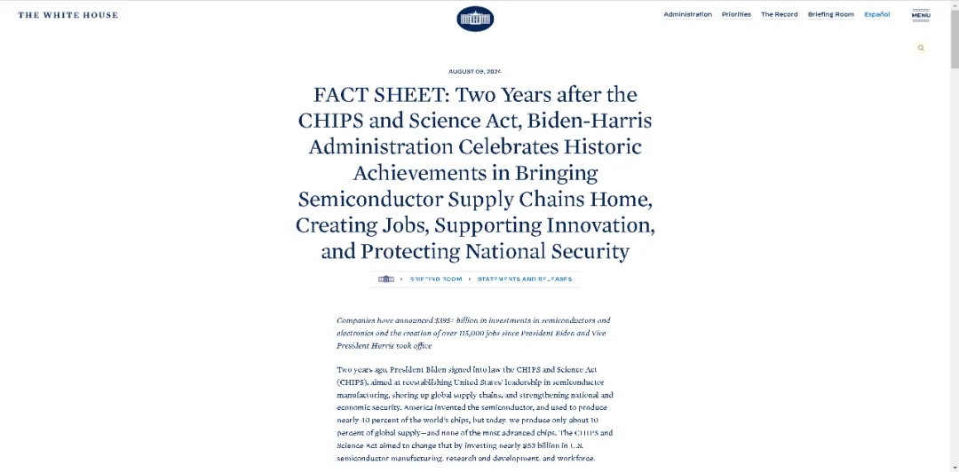 畢竟,就在8月9日,美國白宮還發布了一份芯片法案推出2週年的成果總結文件,這份文件的標題是如此冗長和浮誇,以至於讀者壓根不需要閲讀正文——