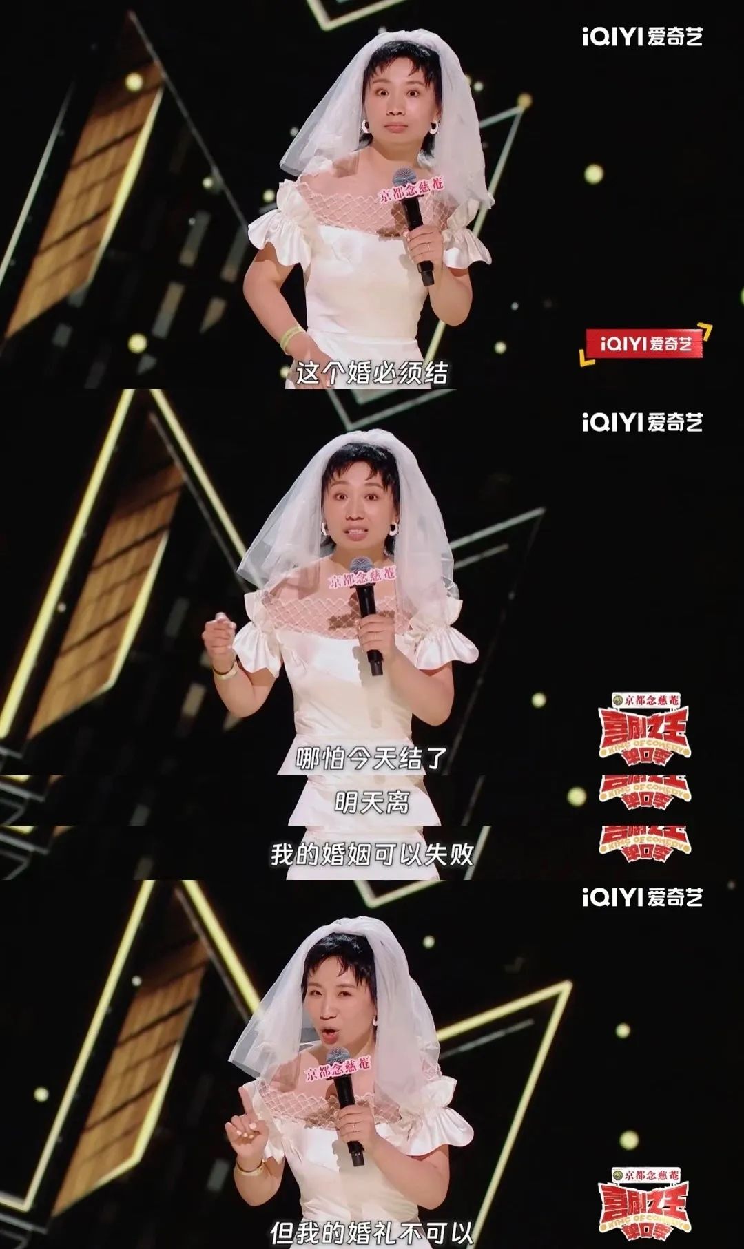 還有小鹿是賽前投票得票數最多的選手,剛剛結婚不久的她一改往日的幹練風格,穿着婚紗上了舞台,主題也從自己的婚禮切入,講述了自己和澳大利亞籍老公的備婚日常,“新娘歇斯底里,新郎事不關己”。