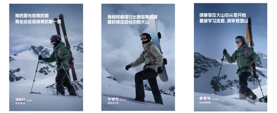 滑雪愛好者蔡嘉帆,則在“人生第一座雪山”的挑戰中,展現出户外運動者重塑自我的成長體驗。蔡嘉帆將攀登雪山的過程描述為“將能力打回原形,變成一個孩子,重新學習走路、跑步到攀登雪山的過程”。