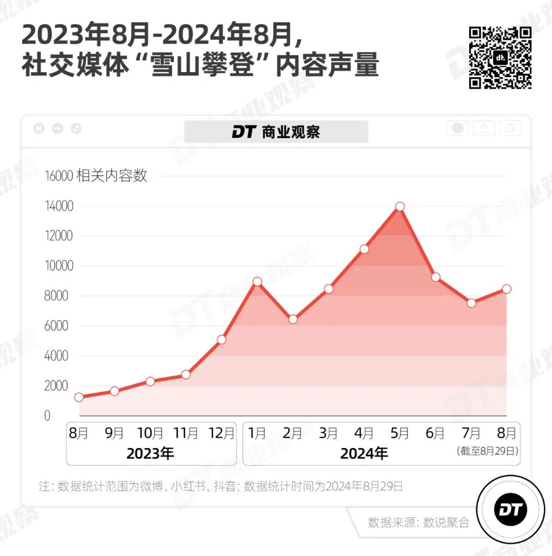 數説聚合平台數據顯示,從2023年7月起, “雪山攀登”在社媒的內容聲量一路走高。在2024年1月和5月,“雪山攀登”相關話題分別出現了熱度的大小峯值。