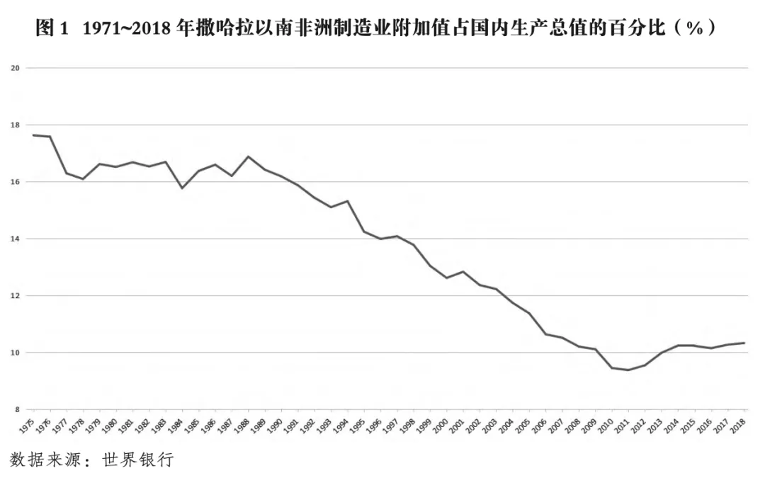 非洲各國政府早就達成共識:“工業化是發展的核心”,並在過去半個多世紀中,不斷致力於規劃工業化路徑,發展本國的工業部門。**然而,無論是20世紀60~70年代強調自力更生和“進口替代”的工業政策,還是此後西方援助國促使非洲國家推行的以市場自由化為特徵的“結構調整”政策,都未能幫助非洲實現持續的工業化轉型與增長。**21世紀,非洲國家重新規劃了工業化的路徑。整個大陸統一思想,制訂了雄心勃勃的“非洲發展新夥伴計劃”(2001)和“非洲加速工業發展的行動計劃”(2007),但這些新舉措的效果仍有待檢驗。雖然在過去20年中,大多數年份非洲製造業的絕對產值基本保持增長,但是增速緩慢,導致其在國內生產總值中的比例反而下降(圖1)。