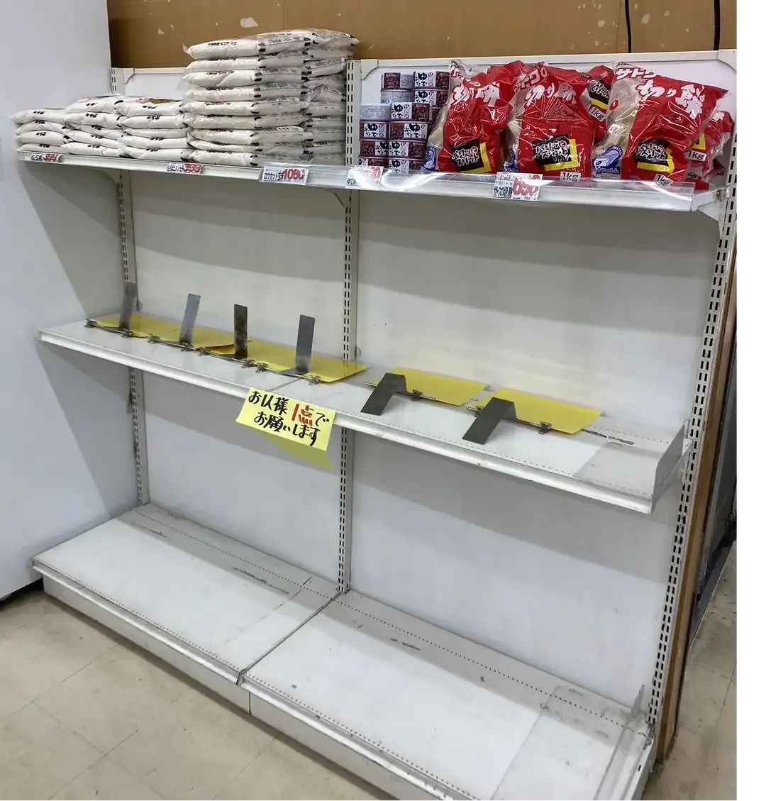 據大阪府上週實施的一項緊急調查顯示,當地約80%的零售店大米斷貨。而類似的情況也出現在埼玉縣、福岡縣、大分縣和廣島縣等地。在一些超市,大米上架僅約30分鐘就被搶購一空,不得不實施限購措施……很多學校甚至不得不減少學生午餐米飯的供應量。
