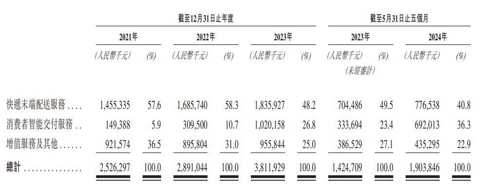 其中,快遞末端配送服務是豐巢的主要創收業務,2021年至2023年,該業務收入分別為14.6億元、16.9億元和18.4億元,然而其佔總營收的比例卻在一直下降,由2021年的57.6%下降至2023年的48.2%,到了2024年前五個月,快遞末端配送服務收入佔比進一步下降至40.8%。