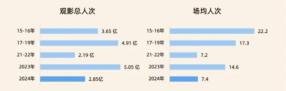 也就是説,2024年暑期檔的票房成績背後,是總觀影人次和場均人次的雙重下跌。