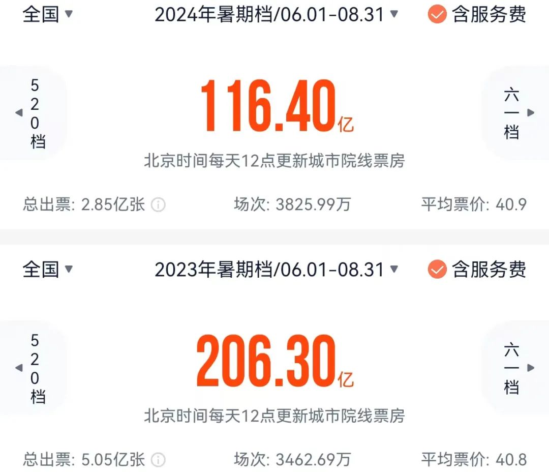 據燈塔專業版數據顯示,2024年暑期檔票房116.40億元,相比去年同期的206.3億接近腰斬,略微高於2014年的112億、低於2015年的124.77億,因而,電影市場回到十年前的水準在業內流傳着,更多帶有悲哀和無奈之情。