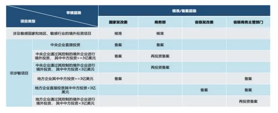 2014年9月6日,商務部發布了****《境外投資管理辦法》(商務部2014第3號令),於2014年10月6日實施。2017年12月26日國家發展和改革委員會(“發改委”)發佈了《企業境外投資管理辦法》****(國家發改委2017年11號令),於2018年3月1日施行。該兩部管理辦法都對“出海”企業的境外項目如何進行境內核準和備案、以及該兩部門對企業“出海”的監督和服務作出了明確的規定,歸納如下。“出海”企業應根據該管理辦法及時就其境外投資項目向商務主管部門和發改委部門申請核准和備案。