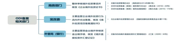 境內投資主體只有完成了ODI(指出海直接投資)備案,並從前述部門分別取得《企業境外投資證書》、《境外項目投資備案通知書》和《境外直接投資外匯登記證》後才能實施海外公司的合法設立、資金的合規出境等。根據《國家外匯管理局關於進一步簡化和改進直接投資外匯管理政策的通知》,自2015年6月1日起,由銀行直接審核辦理境外直接投資項下外匯登記,國家外匯管理局及其分支機構通過銀行對直接投資外匯登記實施間接監管。上述三部門的審核和監管重點及相關法規如下圖所示: