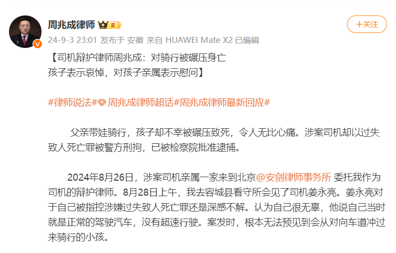9月3日晚,兒童騎行被碾壓案司機妻子發文稱,已經請@周兆成律師 代理案件。當晚,@周兆成律師 通過個人賬號發表對該案件的看法。