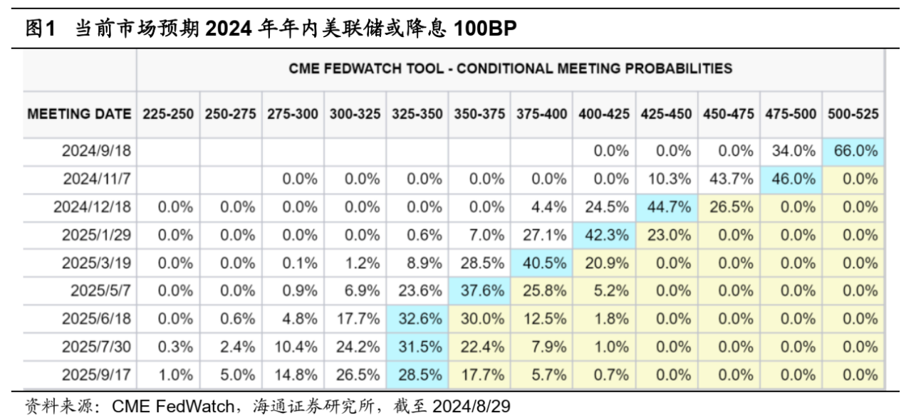 根據CME FedWatch,截止8月29日市場對9月降息25BP的預測概率達66%、對年內三次會議累計降息100BP的預測概率達45%。