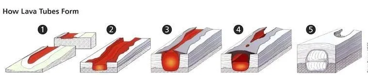 越來越多的證據表明,月球表面下方存在着錯綜複雜、蜿蜒曲折的隧道網絡,這些隧道名為熔岩管。火山噴發形成的液態熔岩在流動時,由於表面冷卻較快,會先一步形成固體硬殼。在硬殼的保温作用下,內部温度較高的熔岩會繼續流動,直到流盡,就會形成中空的管道。由於內部中空,在月球本身的構造活動和隕石的撞擊作用下,熔岩管非常容易塌陷。