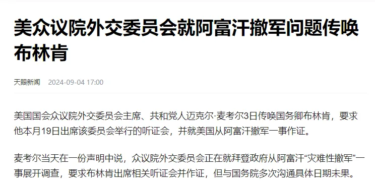 眾議院外交委員會説:因為布林肯,是是阿富汗撤軍的“最終決策者”,他才知道撤軍的整個流程,所以必須找他來問!