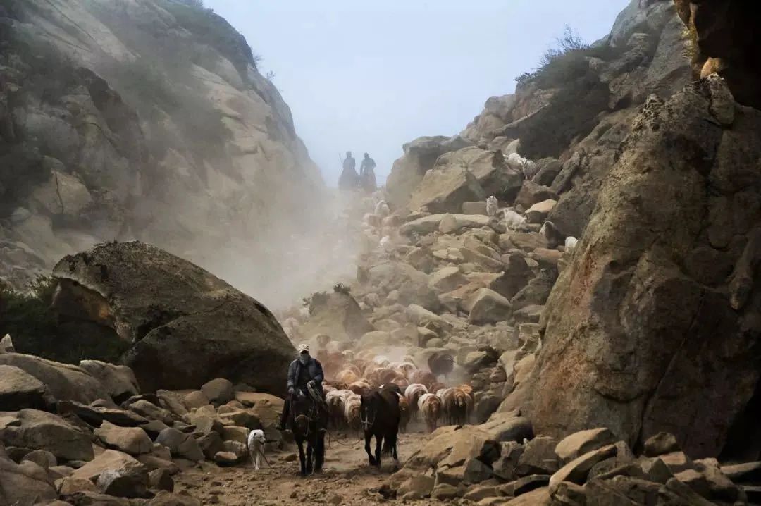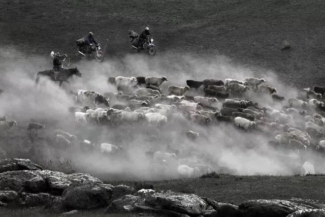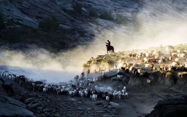 河谷中迴盪着牛羊的叫聲伴着揚起的塵土,分不清是羔兒在尋找母親,還是媽媽在尋找着犢兒。畜羣猶如一股洪流接踵而至,幾天時間,百萬頭牲畜要在滾滾洪流中踽踽而行。