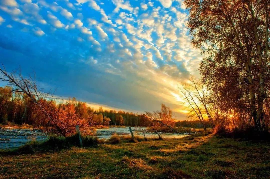 蜿蜒曲折的特克斯河岸的白樺樹俊朗挺拔,與清澈的河水、金黃的田野、純白的雪峯、褪去熱氣的天空撒下的金色光輝、成千上萬的候鳥一同構成了“秋水共長天一色,落霞與孤鶩齊飛”的絕美畫面。