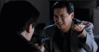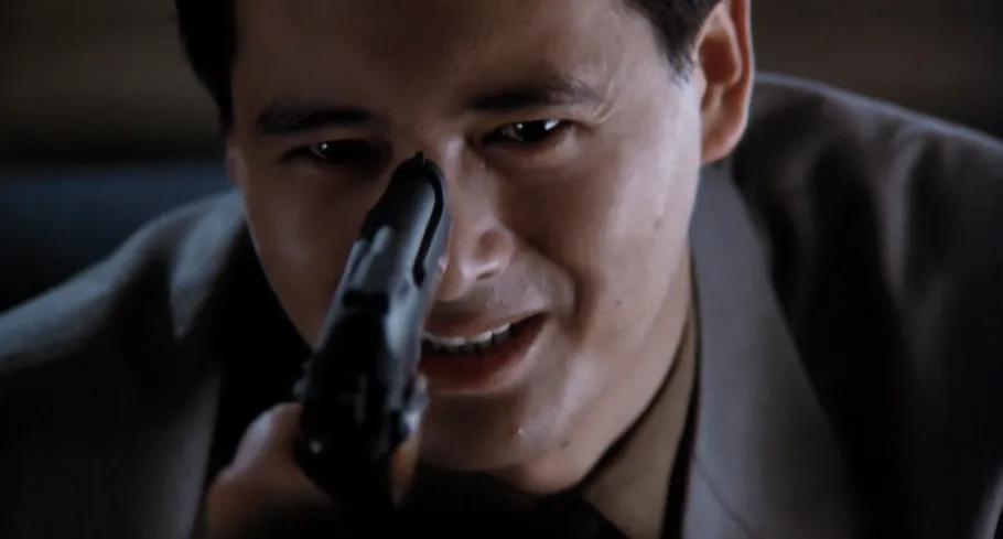 用留有最後一顆子彈的手槍,指着昔日好友,逼問他到底是誰要殺他時。