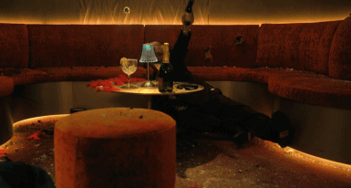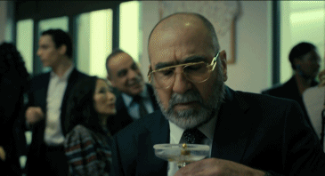 先是被暗殺的人,突然吃痛,然後一個鏡頭的移軸,從側面發現是刺殺者偽裝服務員,將手槍暗藏托盤之下。
