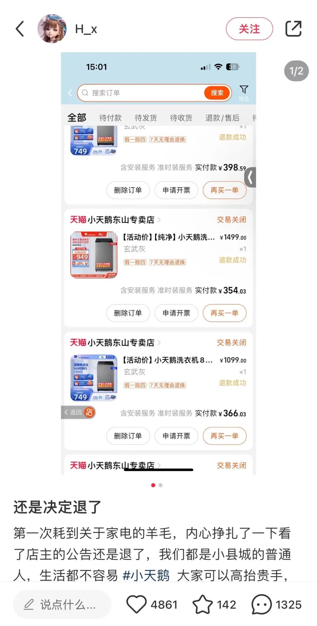 “我也是第一次薅到家電的羊毛,後來看到店鋪公告才知道是價格設置出錯,還是決定退了,生活都不容易。”