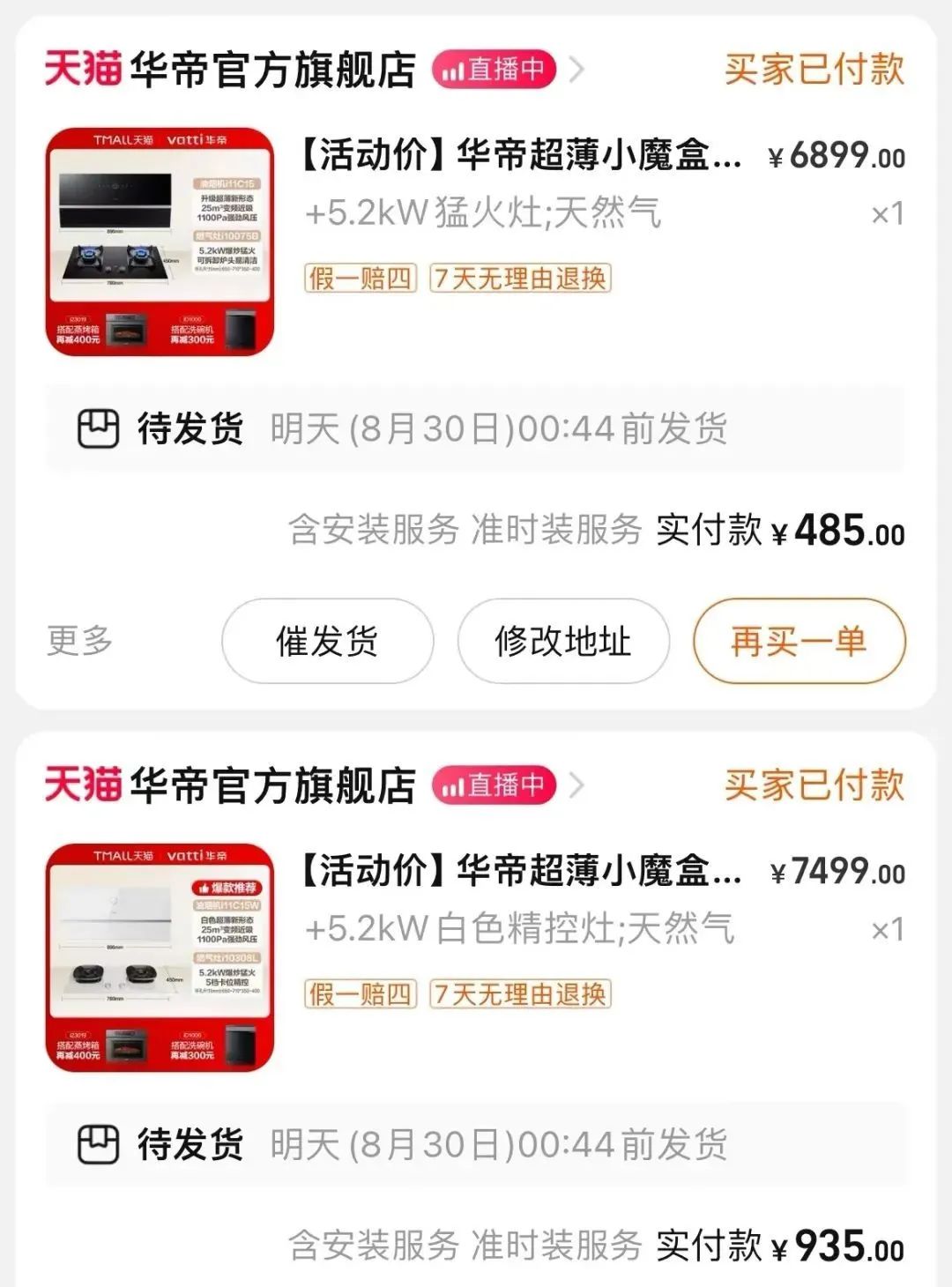 同樣在8月28日凌晨,天貓家居店林氏旗艦店、廚房燃具品牌店華帝官方旗艦店,也出現了超低價銷售的情況,一些產品的優惠折扣甚至低至1~2折,短時間內被多位消費者搶購。