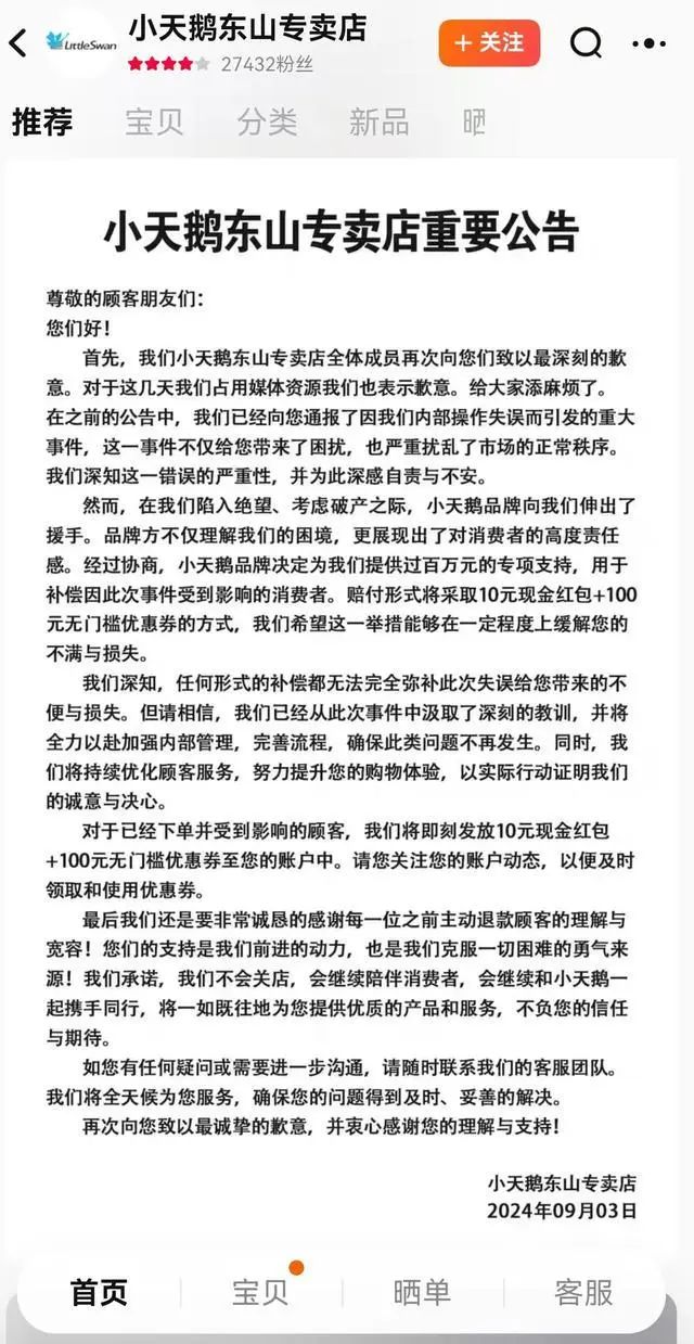 9月3日,小天鵝東山專賣店發佈公告稱店鋪不會關,並透露,小天鵝品牌方將給予店鋪超百萬元資金支持,用以補償受此事件波及的消費者。