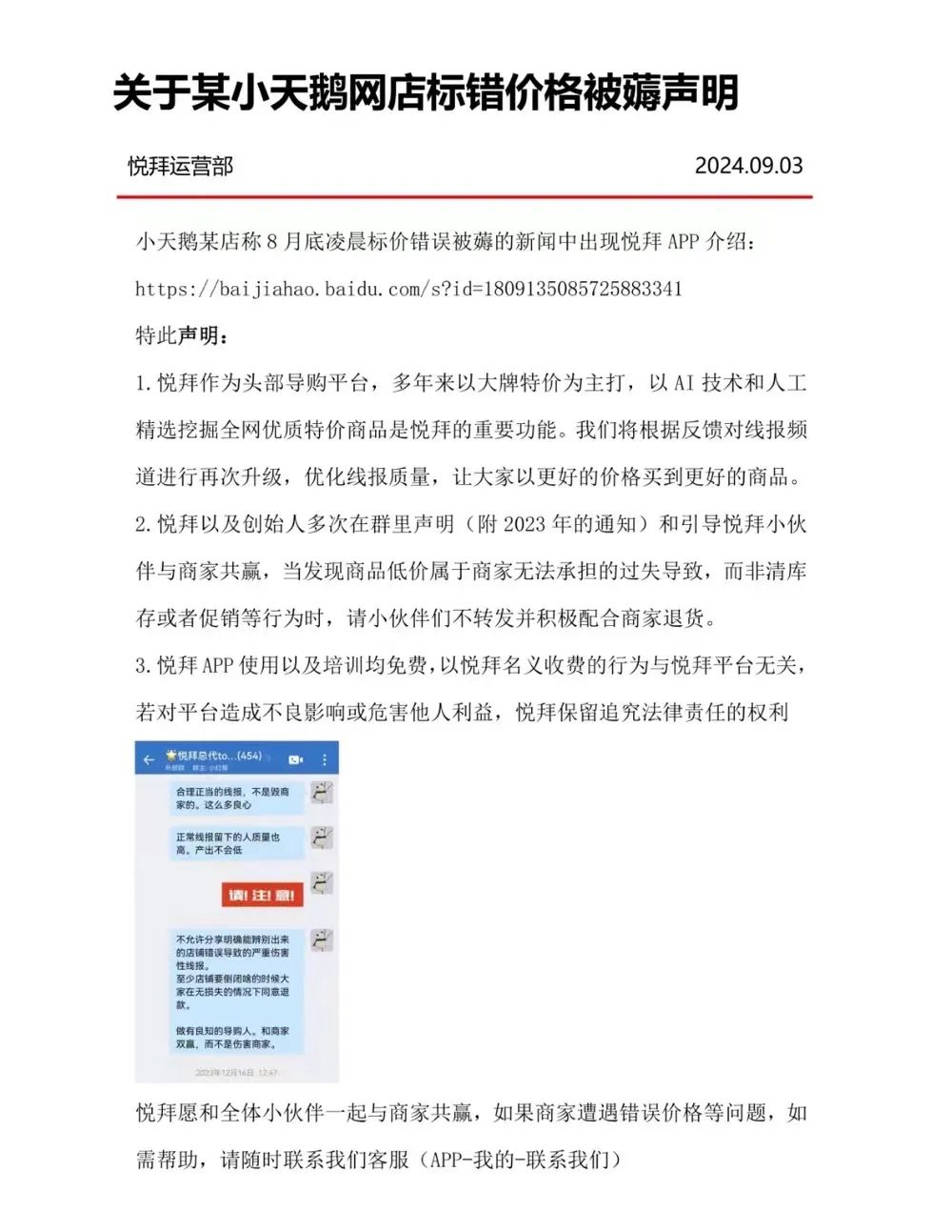 隨着小天鵝事件的持續發酵,“悦拜”APP在昨天發佈了免責聲明。