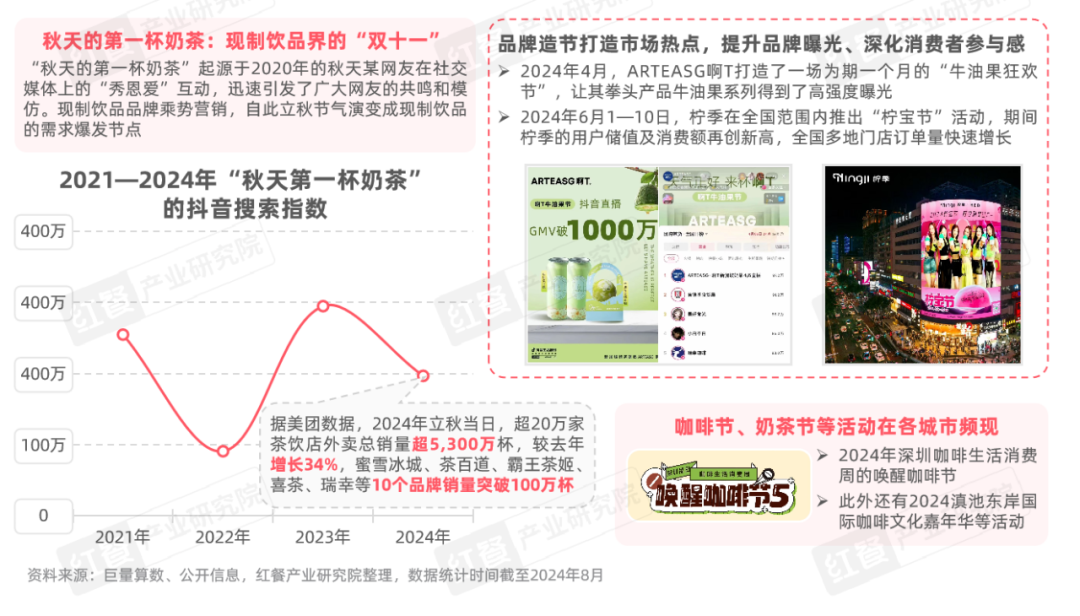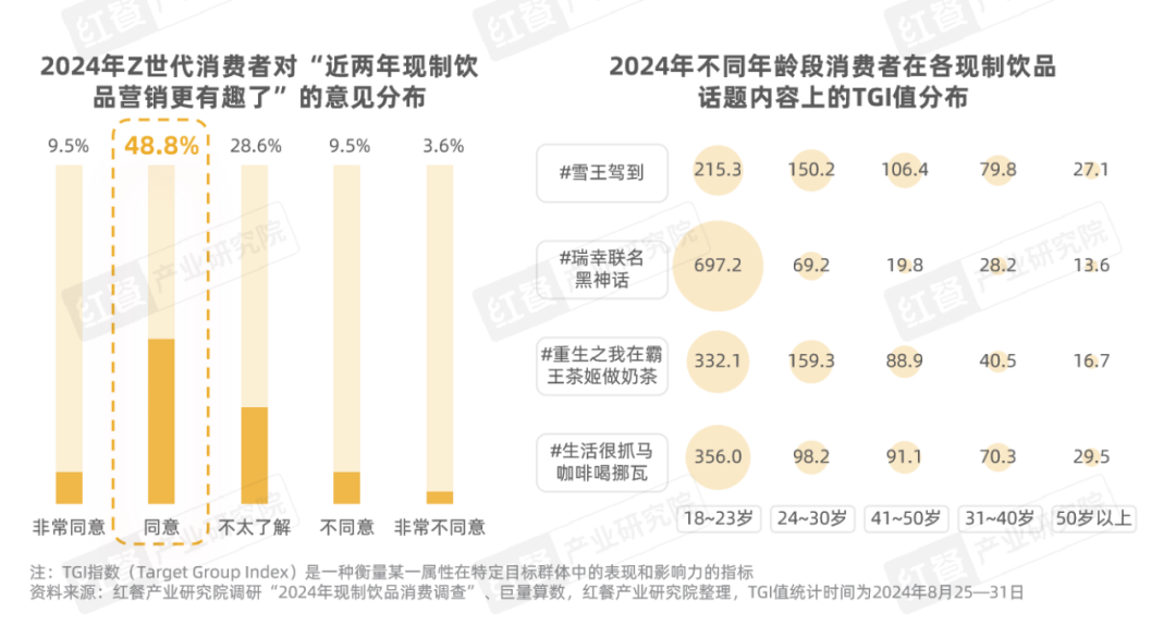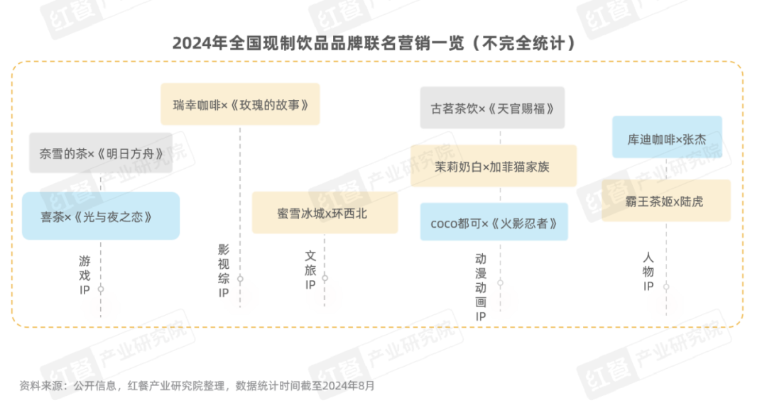 據紅餐產業研究院調研,**58.3%的Z世代消費者認為近兩年現制飲品賽道的營銷活動在趣味性上有顯著提升。**近年來,現制飲品品牌們紛紛採用跨界聯名、創意造節、體育明星代言以及活躍的社交營銷策略,這些新穎有趣的方式增強了現制飲品市場的活力以及品牌競爭力。