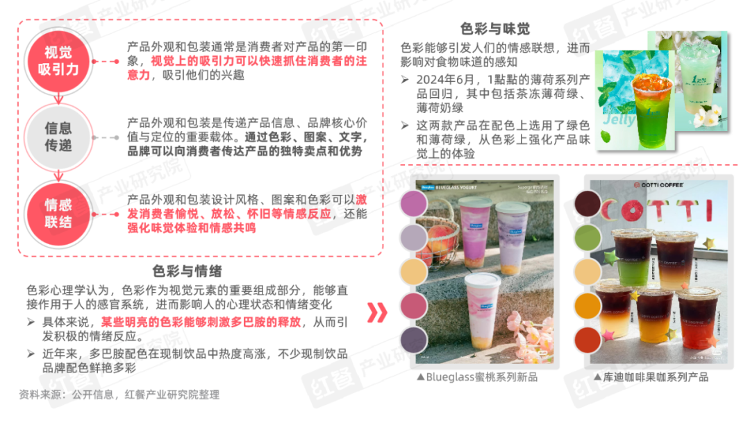 **在產品外觀和包裝方面,多巴胺配色在Z世代消費者羣體中熱度高漲。**據紅餐產業研究院調研分析,視覺吸引力成為Z世代消費者在社交媒體上積極分享並展示產品的核心動力。近年來,現制飲品的產品外觀掀起了一股多巴胺配色潮流。這一現象反映了現制飲品品牌不僅精準捕捉了Z世代追求個性化和情緒共鳴的需求,還通過視覺進一步豐富產品的感官體驗。
