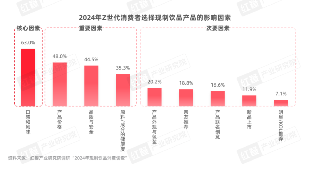 在產品方面,**現制飲品的口感與風味是Z世代消費者最為核心的考量因素。**據紅餐產業研究院調研,超6成Z世代消費者在選擇現制飲品產品時會考慮其口感和風味。