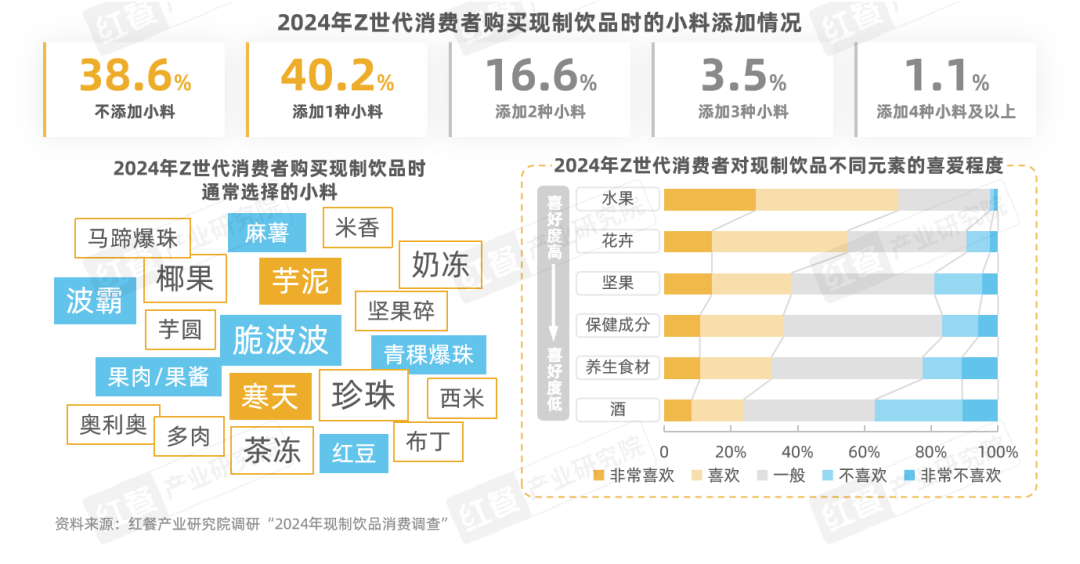 與此同時,Z世代消費者展現出對純粹口味的喜愛。據紅餐產業研究院調研,40.2%的Z世代消費者表示在購買現制飲品時通常只添加一種小料,而通常不添加小料的佔比也達到38.6%。具體來看,珍珠、寒天、脆波波、芋泥這幾款小料在Z世代消費羣體中比較受歡迎。