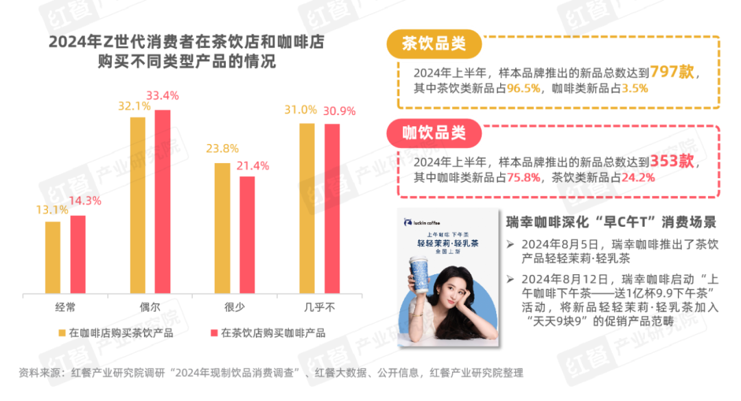 此外,當下,**隨着生活節奏不斷加快,Z世代消費者傾向於在一天中的不同時間購買不同的現制飲品。**比如,早上喝咖啡提神,下午喝茶飲放鬆。在這樣的背景下,“早C午T”的場景疊加趨勢日益明顯。