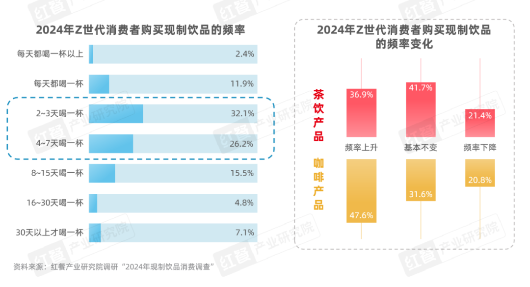 Z世代消費現制飲品的消費粘性基本上以周為單位。據紅餐產業研究院調研,72.6%的Z世代消費者表示其每週都會購買現制飲品,其中,以2~3天一杯和4~7天一杯為消費頻率的Z世代消費者佔比分別達到32.1%和26.2%。