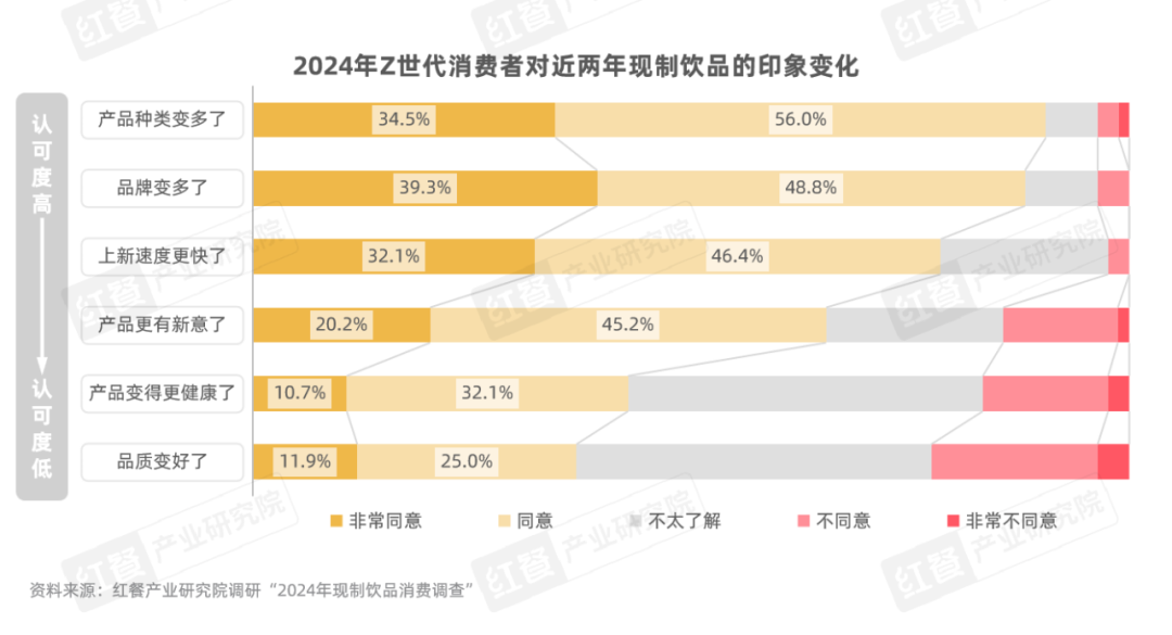 紅餐產業研究院調研發現,**9成左右的Z世代消費者認為現制飲品的種類豐富了、品牌變多了,****超6成Z世代消費者認為近兩年現制飲品上新速度加快,且這些新品在創意上更加出眾。**近年來,現制飲品品牌對Z世代消費者的需求反應迅速,在產品差異化上持續發力。