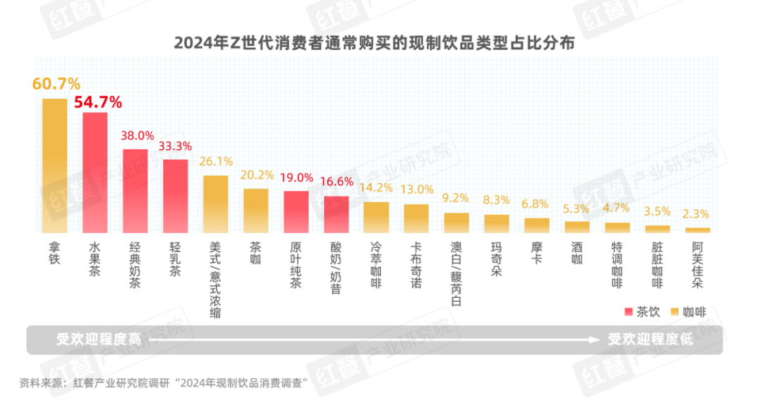 此外,**經典奶茶、輕乳茶等茶飲產品在Z世代消費羣體中擁有較高人氣。**整體上看,茶飲在Z世代消費者羣體中受歡迎程度相對更高。