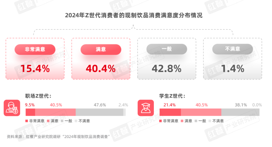 **Z世代消費者在2024年的現制飲品消費者滿意度整體較高。**55.8%的Z世代消費者對現制飲品消費表示“非常滿意”或“滿意”。