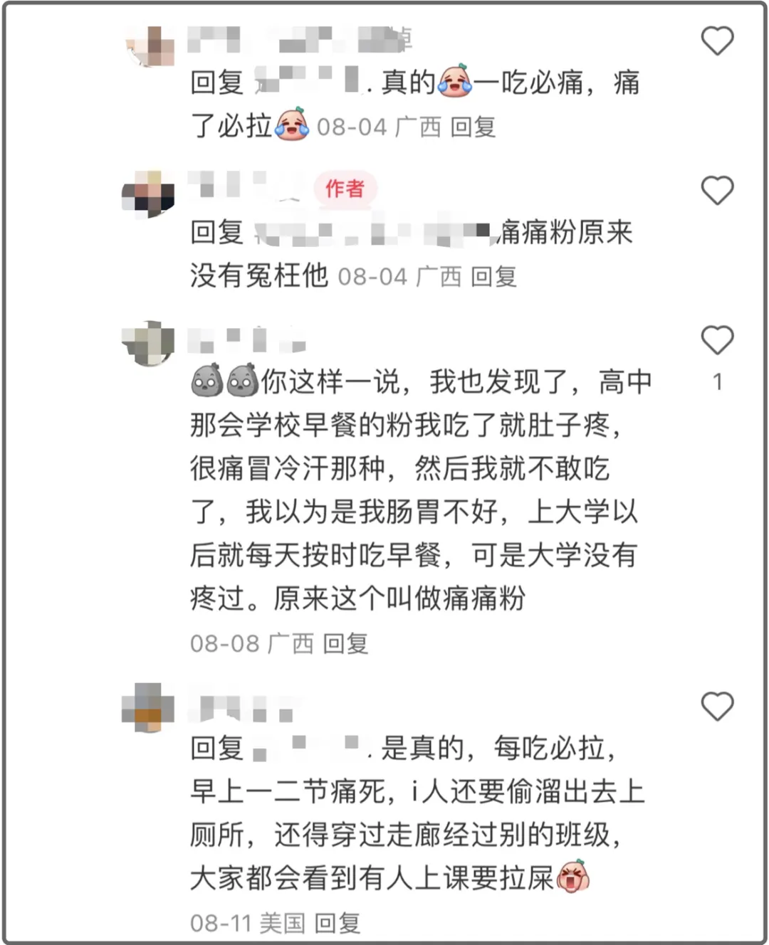 還有人開玩笑説:“學校早餐供應痛痛粉的那一天,廁所的上座率和翻枱率會比平時提高25%。”