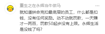 門店大店長為了收益,一切工作都在追求業績,傾向要求手下的員工加班,制定嚴苛的罰款規定……小紅書上就有不少永輝的員工吐槽永輝罰款無底線。