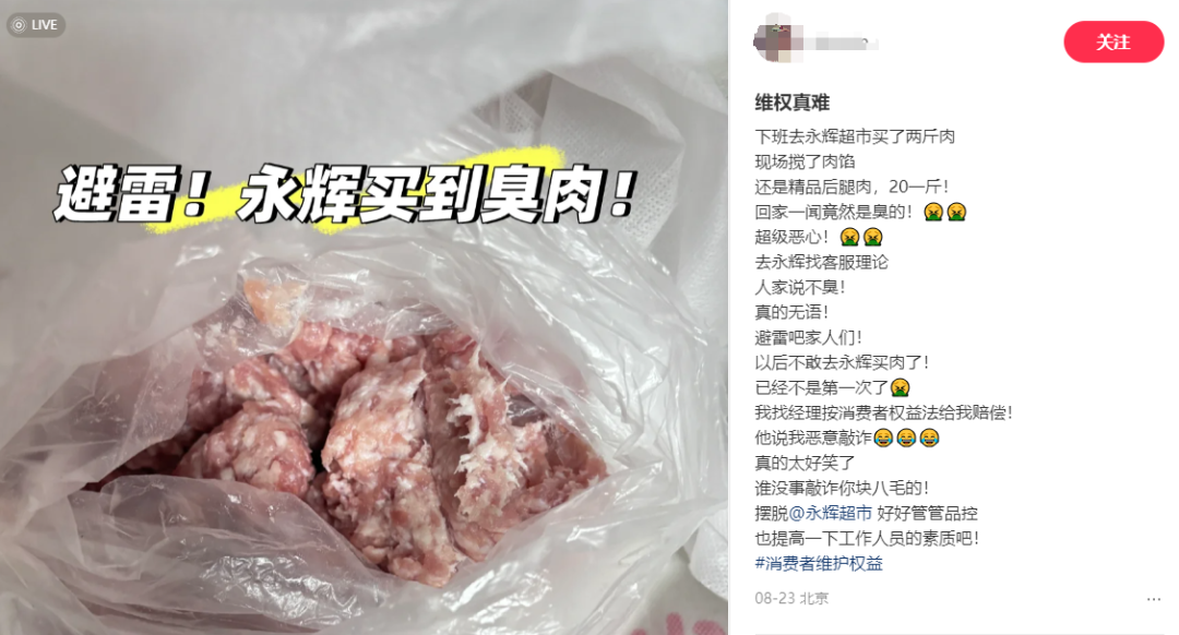 小紅書上有消費者反映,下班去永輝超市買了兩斤肉餡,回家一聞發現肉是臭的。去永輝找客服理論,居然反被説“惡意敲詐”